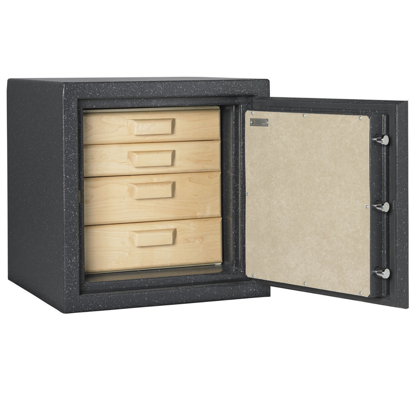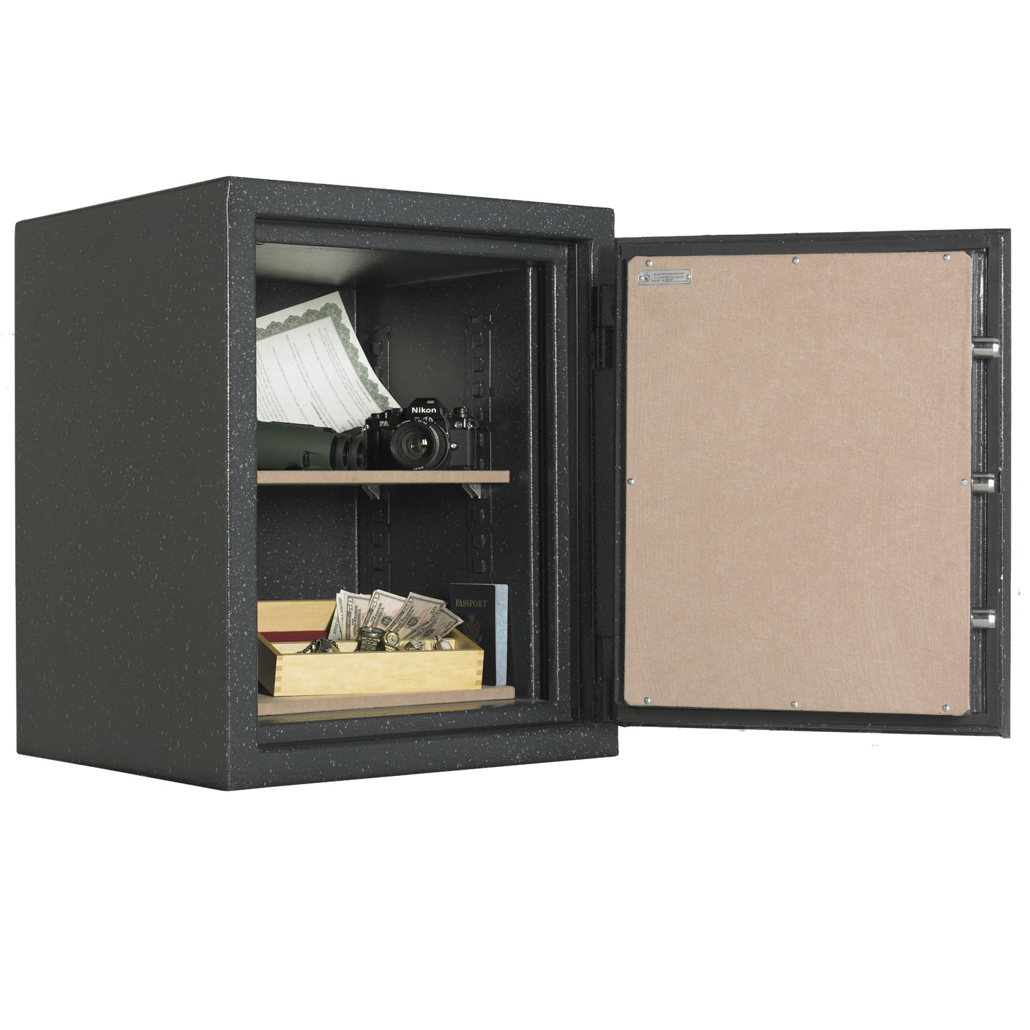 - 2-5/8″ thick body, consisting of 1/8″ outer and inner steel plates creating a burglary resistant structure enclosing a unique proprietary fire resistant material.
