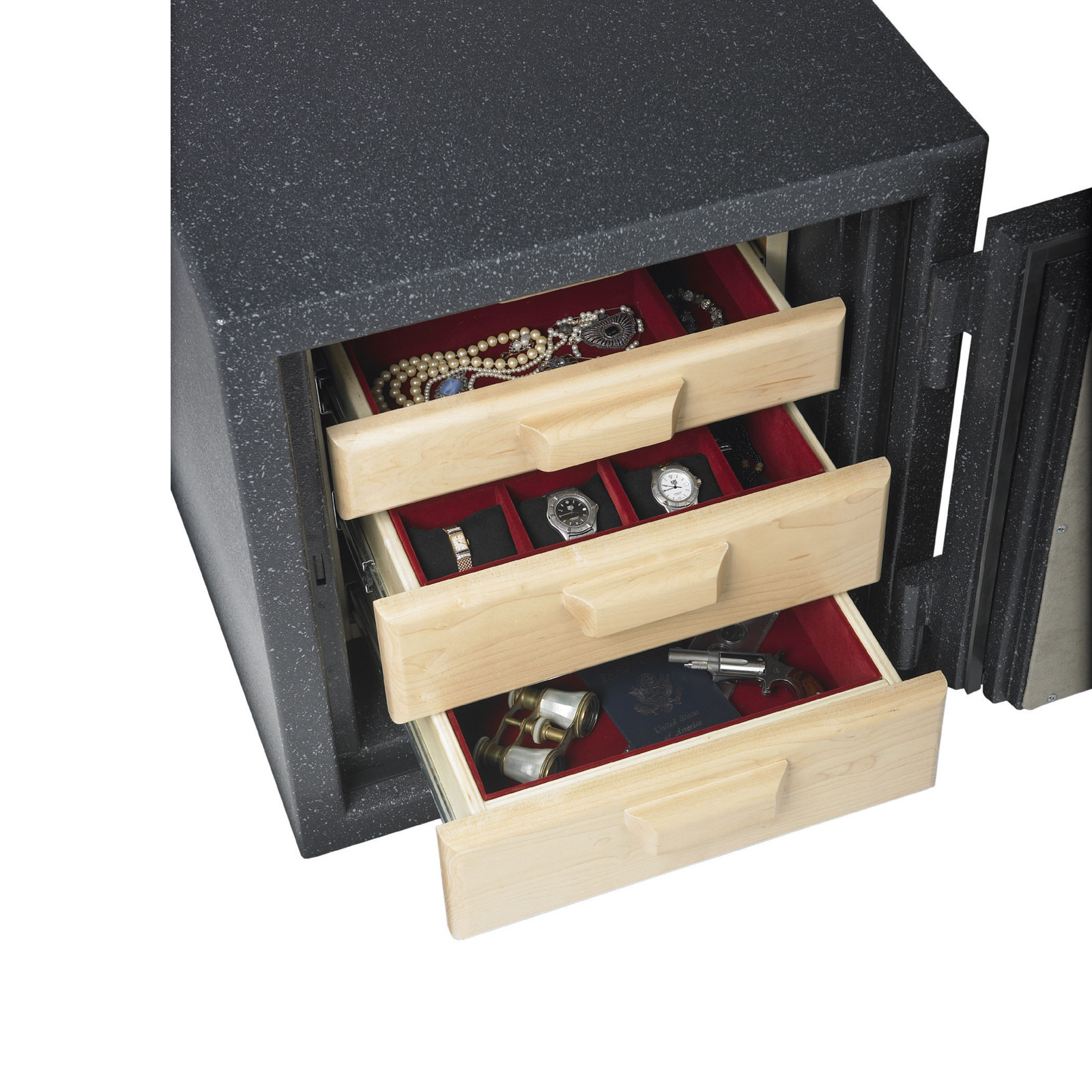 fronts and maple veneer and finished in a rich honey maple stain. NEW recessed door pulls give these cabinets a more streamlined appearance and makes for an easier fit into a variety of Amsec safes. All drawers are elegantly