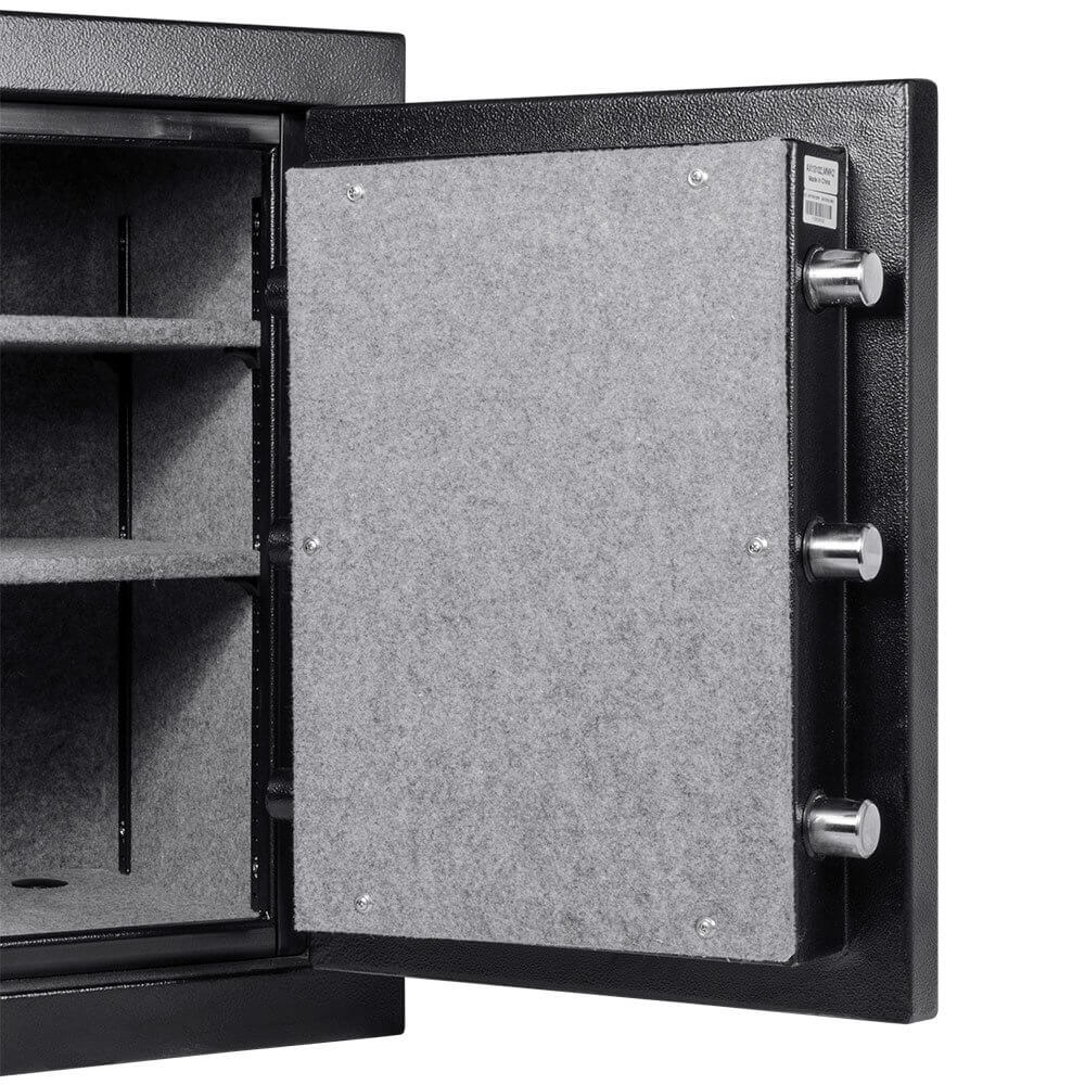 The 2.6 Cubic Foot Fire Vault by Barska features all-steel construction designed to protect and secure your valuables. The internal shelves are fully adjustable to meet your specific storage requirements, and are carpeted for additional protection. The electronic keypad lock features a low battery warning and a lock out mode in the event that the incorrect code is entered too many times. Two back-up keys provide secondary access to the Barska Fire Vault Safe with the lock being located underneath the digital faceplate. The 2.6 Cu Ft Fire Vault’s solid steel three point deadbolt locking mechanism ensures that your valuables are safely secured inside. This Barska Fire Vault Safe also comes with pre-drilled holes on the bottom of the safe to securely bolt down to the floor. Mounting hardware is included.