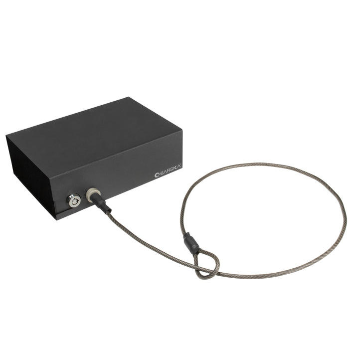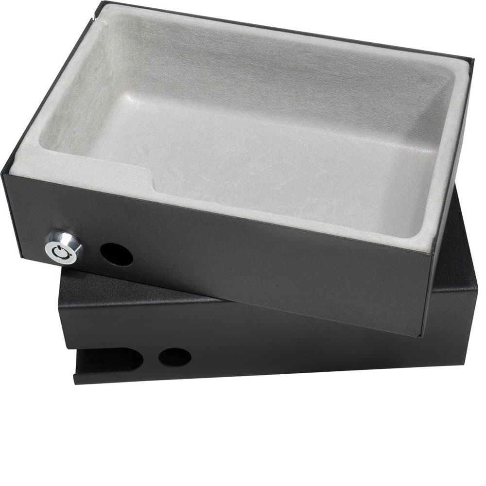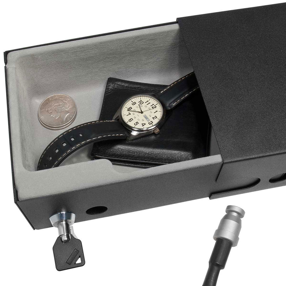 Security to go! An ideal size safe for the car or when traveling to keep personal items protected. Open safe by inserting key and either gently pulling or pushing the drawer from outer casing. Easily install the long self-locking security cable so that the safe can be tethered to a large fixed object for added security. Cable hole lets you charge an electronic device while safely locked inside the safe