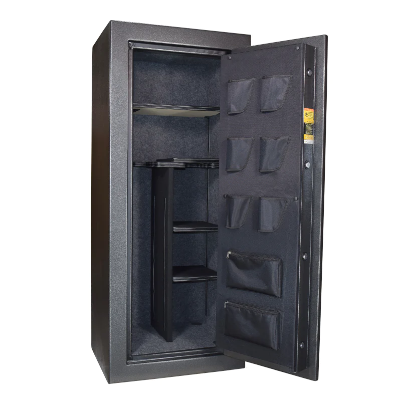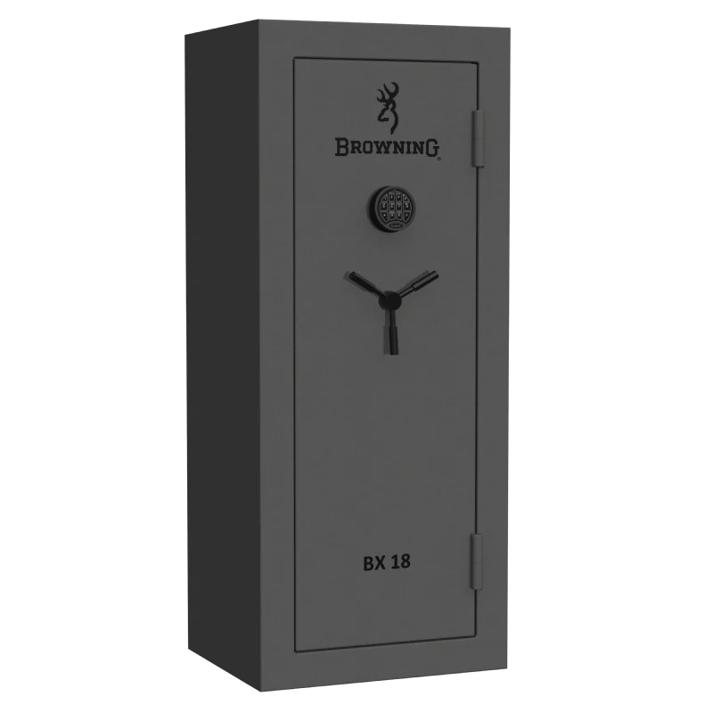 The outside of the Browning BX18 BX Series Gun Safes is painted a nice hammer gray textured finish. The lock, handle, and Browning Logo come in a black finish. The handle is a 3-spoke handle which allows you to open and close the door easily. The inside features a raised floor. It will hold 18 long guns plus 6 handguns on the door organizer.