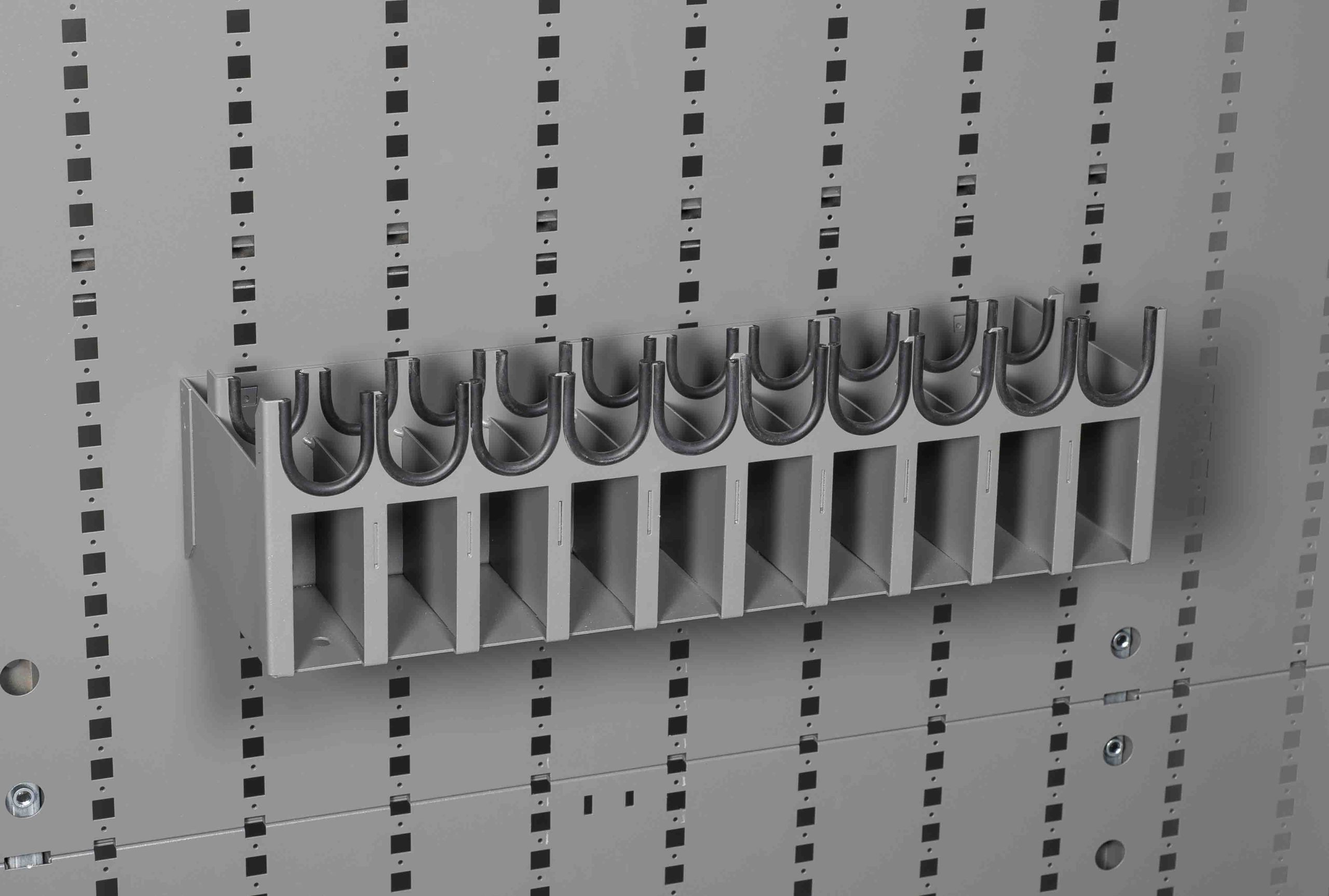 The components for the Argos weapons cabinets and racks include numerous bases, rifle and pistol brackets, shelves, hooks and bins to accommodate various firearms, ammunition, tactical gear and accessories. We’ll make sure that all of your gear is stored neatly, safely, and easily accessible. The 10 Pistol Cradle provides storage for up to 10 pistols of various designs and extra magazines. Durable rubber molding is used where pistols come in contact with the cradle to prevent scratching. Two Pistol Cradles can be placed side by side to span the entire width of a cabinet or rack, or they can be moved to a desired location as all Argos accessories are adjustable.