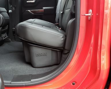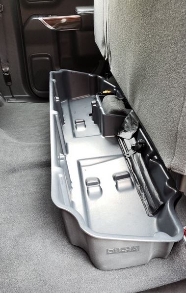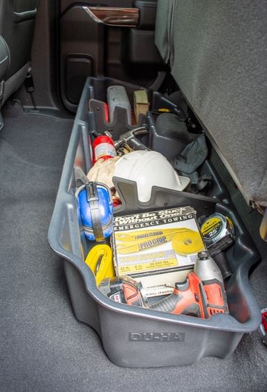 The DU-HA is a great way to arrange your pickup truck and keep your stuff secure and out of sight, whether you’re a contractor, sportsman, or just someone looking for a great way to keep your gear safe and out of sight. Under or behind the back seat of your vehicle, the DU-HA helps you to comfortably and securely store your gear, arms, power tools, tow ropes, tie-down belts, first aid kit, tackle, bungee straps, helmets, boots, gloves, chains, jumper cables, and much more. The DU-HA comes with a two-piece weapons rack/organizer so you can comfortably store your arms upright. The gun racks and organizers are easily removable, allowing you to store larger pieces if desired.