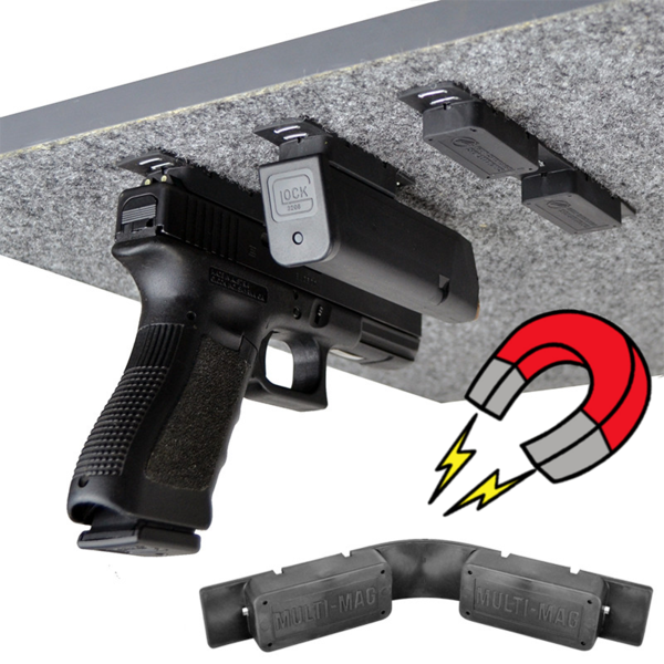 The Multi-Mags’ soft-grip rubber coating offers more variety and benefits than competing hard shell magnets. Quickly staple it to wood or snap it to a metal surface. The two tethered magnets can be kept as one unit for uses like storing a semi-automatic under a shelf, or cut in half to separate into two magnets, which are perfect for two magazines.