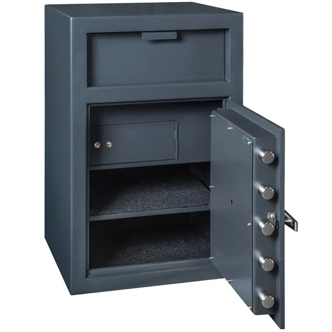 The Hollon FD-3020EILK Depository Safe with Inner Locking Compartment is a large deposit safe that includes an extra compartment inside with a keyed access. That allows only the person with the key to access the drops. It also features an anti-fish baffle which prevents theft through the deposit door, 4 anchor holes to mount the safe to the floor and five 1.25” diameter solid steel locking bolts. It has a UL Listed Type 1 Electronic Lock with a lockout penalty, and the heavy duty dead bar prevents door removal during a forced entry attempt. The locks and relocker are protected by a drill/ballistic resistant hard plate