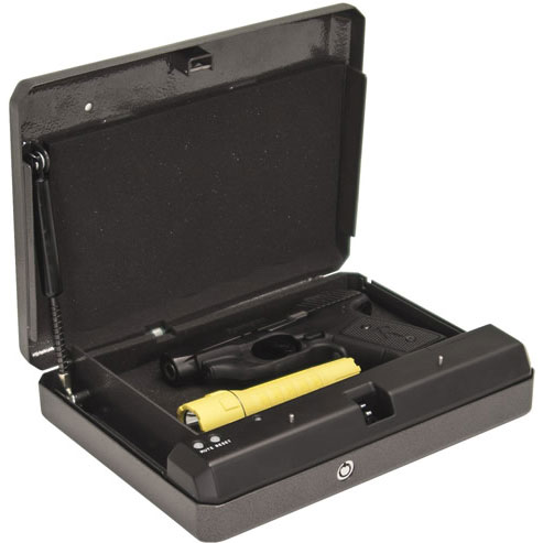 The HD-100 will fit most standard handguns and is perfect for other small valuables. The included Security Cable allows for additional protection when at home or in an automobile. With the HD-100 you will have quick access from descrete locations, such as in a desk drawer or under the seat of a car or truck. The HD-100 is TSA compatible for airline use.