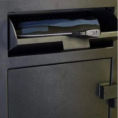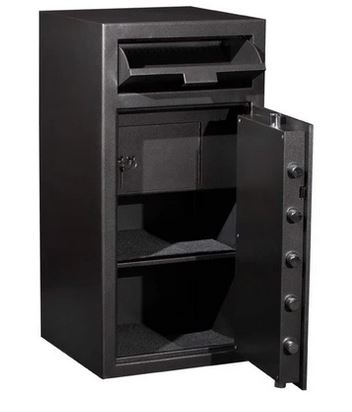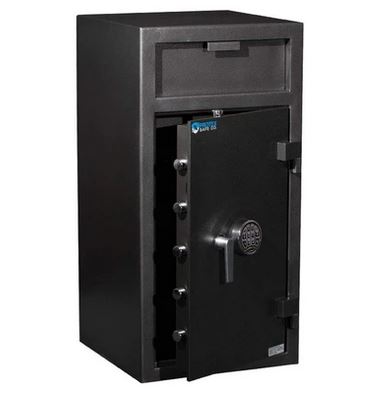 Protex B-rated depository drop safes are ideal for convenience stores, hotels/motels, churches, gas stations/car washes, restaurants, and other locations. The safe has a laser-cut 1/2-inch steel plate door, a spring-loaded re-locker, chrome-plated heavy-duty steel locking bolts, and an anti-drill lock plate. The door has a brushed chrome plated handle as well as vault type hinges with an internal dead-bar to prevent the door from being removed while the safe is locked. Anchoring the safe to a concrete floor is made possible by mounting holes and anchoring gear.