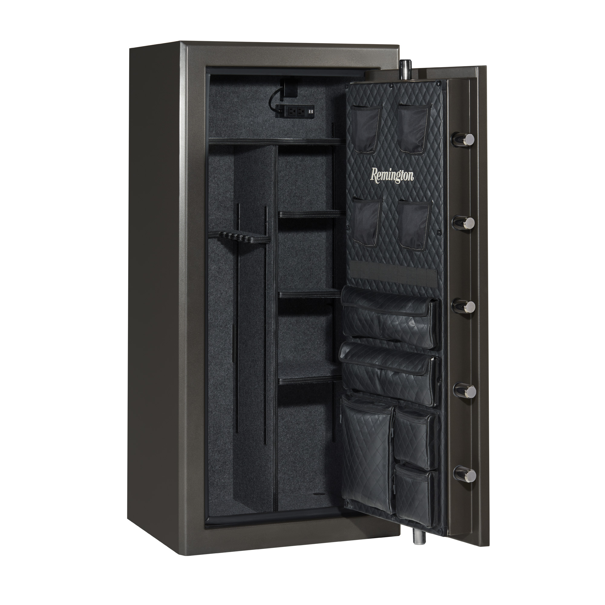 Admiring the harmony of innovation and time-proven excellence is what the Remington Express 24-Gun Safe is all about. Prepared for the elements with a 12-gauge industrial steel body and Triple Seal™ technology, this fireproof and waterproof safe is one you can depend on to keep your firearms and valuables protected. Backed by a high-performance SecuRam™ UL Rated electronic lock, ten robust steel locking bolts, and a relocker device for maximum in-home security. Motion-activated LED lights come installed inside your safe for easy access in low light conditions. The fully carpeted interior features ample storage with the deluxe pocket door organizer, Zero-Sag™ top shelf, barrel rests, and adjustable side shelves. Keep your favorite gun safe accessories charged with the integrated UL Rated dual power outlets and two USB ports. Includes a waterproof bolt-down kit for use with the pre-drilled holes and our best-in-class Lifetime Warranty that covers your entire Remington safe against theft, fire, natural flood, locks, parts, and paint.