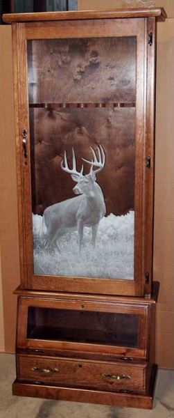 A superior solid pine wood gun cabinet with a separate locking display space for handguns that can hold up to eight guns. The gun portion has a tempered glass door with keyed alike locks, and the cabinet has three distinct locking storage spaces in total. Guns are protected with felt-lined stock and barrel supports to prevent scratches and bangs.