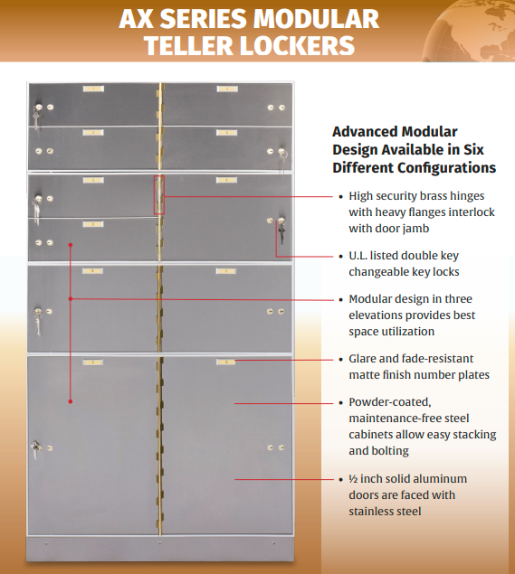 Bridgeman’s AX line of teller lockers combines 1/2 height with 1/2 depth “Cabinets are powder coated rust-resistant steel with solid aluminum doors that are faced with stainless steel. They are available in six distinct configurations and have a modular design and size that allows for mix-and-match combinations to better meet the needs of both the hospitality and banking industries. 11 1/8″, 22 14″, and 33 3/8” are the three elevations “provide for the most efficient use of space while maintaining the appropriate number and size of apertures
