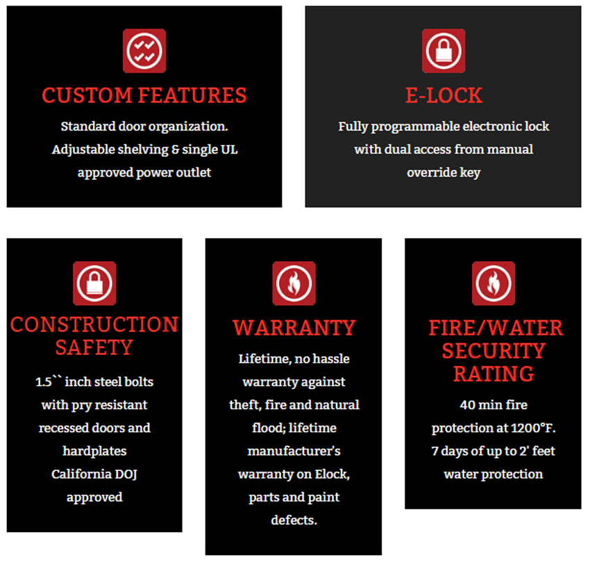 Step into total protection with a safe that is the first in its class to offer heavy gauge steel, 1.5” locking bolts, a fire rating of an impressive 40 minutes at 1200°F, all while including our proprietary Triple Seal keeping this safe waterproof up to 2ft for a full seven days giving you piece of mind that your precious valuables will be safe even after coming home from vacation to a flooded basement. Fully adjustable shelves and half U shaped / half rack style carpeted barrel rests ensure total customization. The full door organizer, fully carpeted shelves, Elock and UL rated outlet make this safe truly best in class at a price that will allow you to keep filling it.