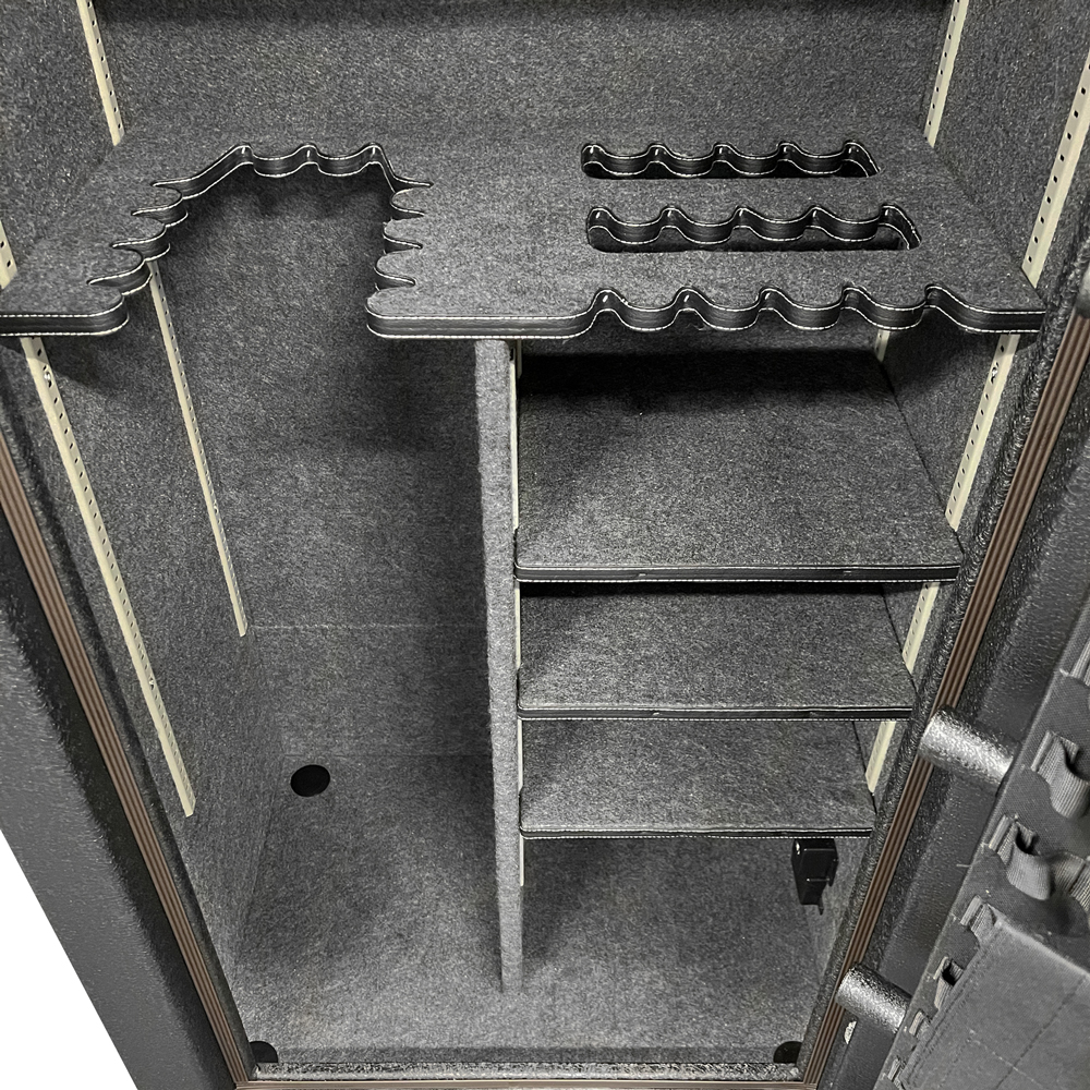 - Four Adjustable Shelves and Dual Gun Rack Included